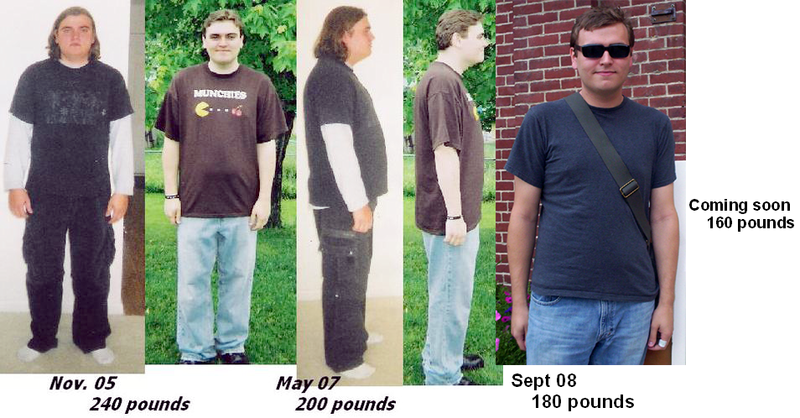 Anyway, I set a goal in November of 05 to lose 80 lbs. I was 240 lbs at the time so 80 lbs would put me at 160, which is right in the middle of the normal weight range for my height and build (per the Body Mass Index). Well, since then I've lost 60 pounds! I'm 3/4 to my goal weight! I currently weigh about 180. So, basically it took me 3 years to lose 60 pounds, which equals 20 lbs a year.